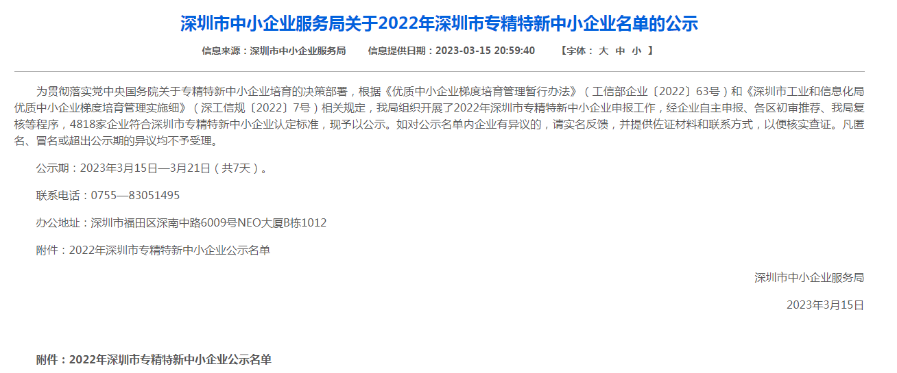 2022年3月15日,深圳市中小企業(yè)服務局公布了2022年深圳市“專精特新”中小企業(yè)名單,深圳市琉璃光生物科技有限公司名列榜單,榮獲“深圳市專精特新中小企業(yè)”稱號,成為發(fā)展道路上新的里程碑。